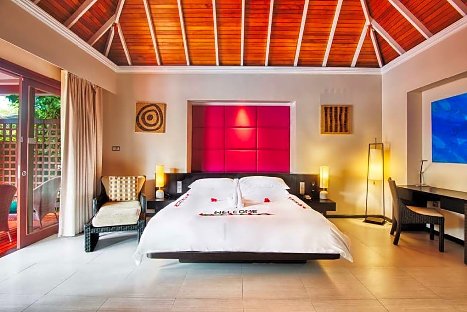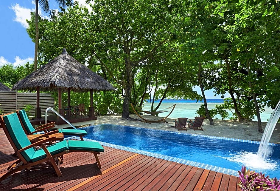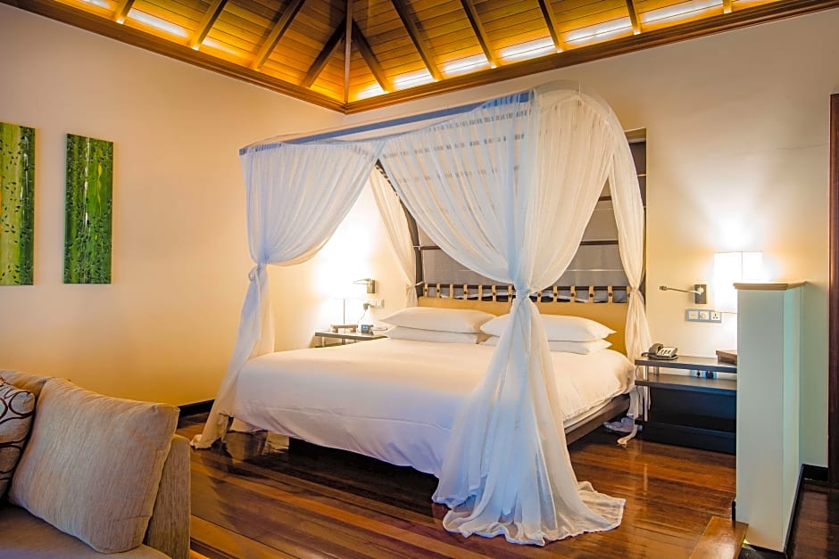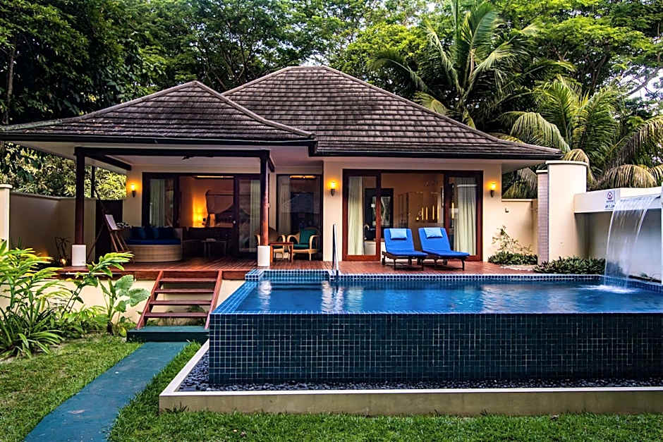 This villa features a private deck with a cascading pool and an outdoor rain shower. Each is air-conditioned and comes with a separate dining and seating area with a flat-screen TV and a sofa. The private bathrooms have a bath and shower with free toiletries.